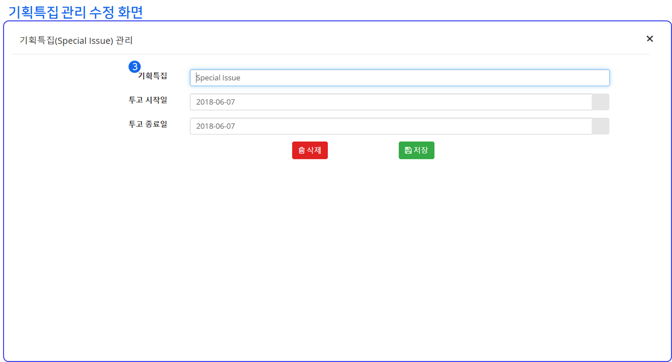 ❸ 기획특집을 수정하기 위해서는 수정(Edit) 버튼을 클릭하여 제목과 기한을 수정한 후 저장을 누르거나 삭제할 수 있습니다.