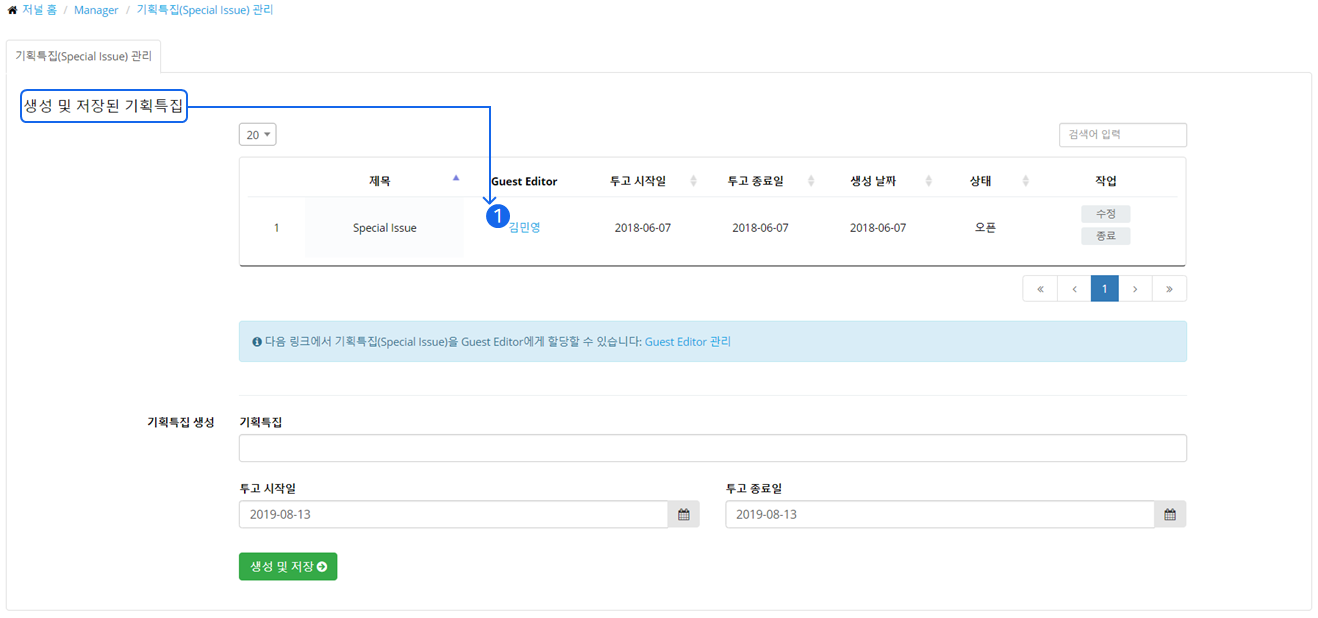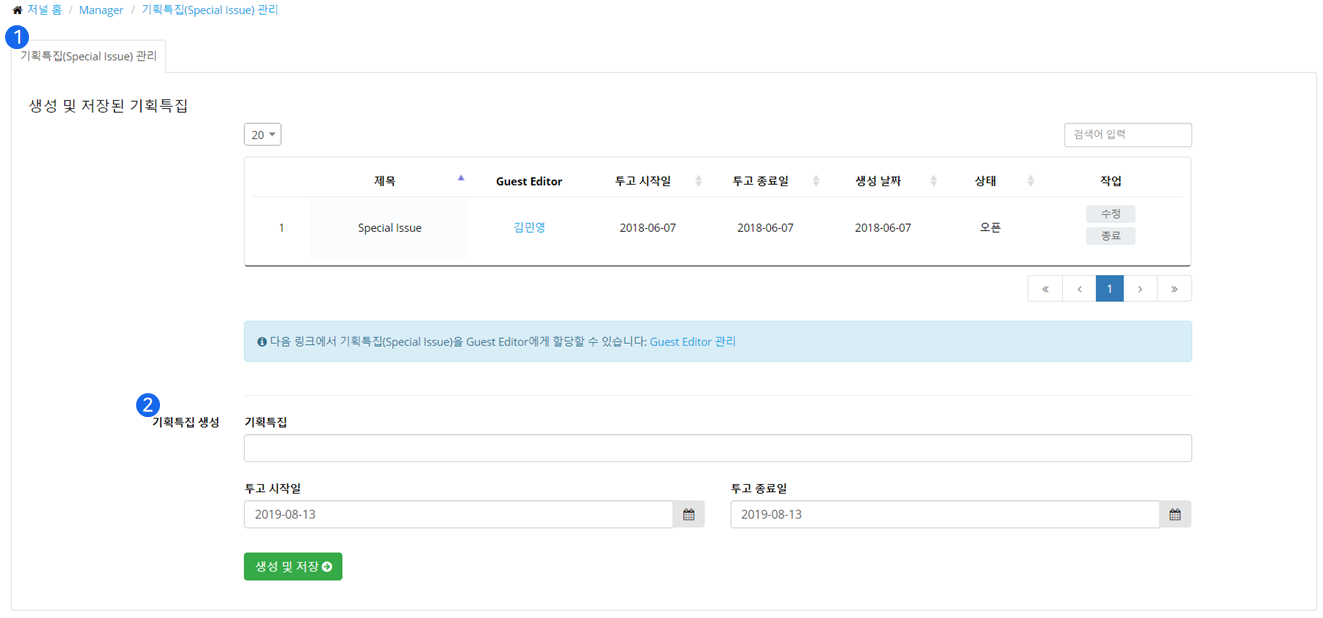 ❶ 유료 서비스의 경우 기획특집(Special Issue / Section)을 생성하고, 초빙편집장을 임명하여 논문을 접수받을 수 있습니다.
