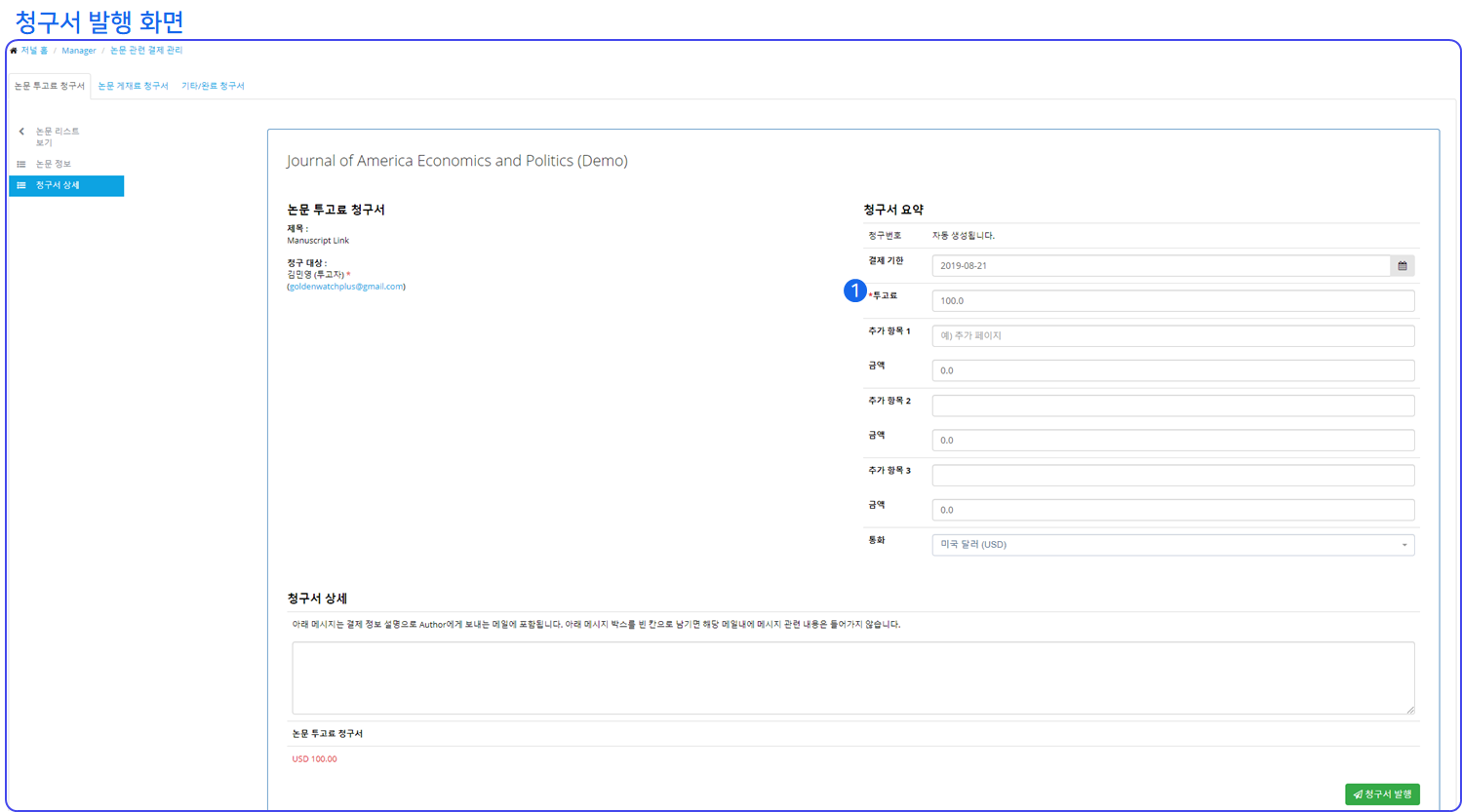 ❶ 논문 게재료 관리는 투고료 관리와 동일합니다. 다만, 논문 게재료는 논문 페이지 수 등 논문마다 금액이 다르기 때문에 자동 청구서 발행 옵션이 존재하지 않고 직접 수동으로 청구해야 합니다.