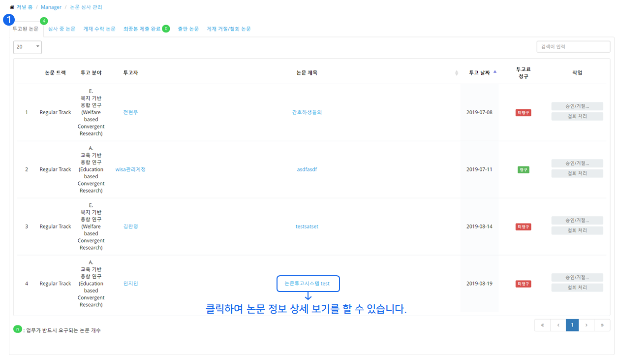 ❶ 수정 투고 논문(Revision Submitted) 탭에서는 저자가 수정을 하여 재투고 했을 경우 관리자가 이를 확인하여 승인하거나 거절할 수 있습니다.