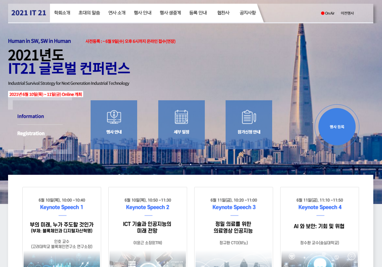 씽크온웹의 고객사인 한국정보처리학회에서 2021년도 IT21 글로벌 컨퍼런스 온라인 행사를 함께 해주셨습니다.