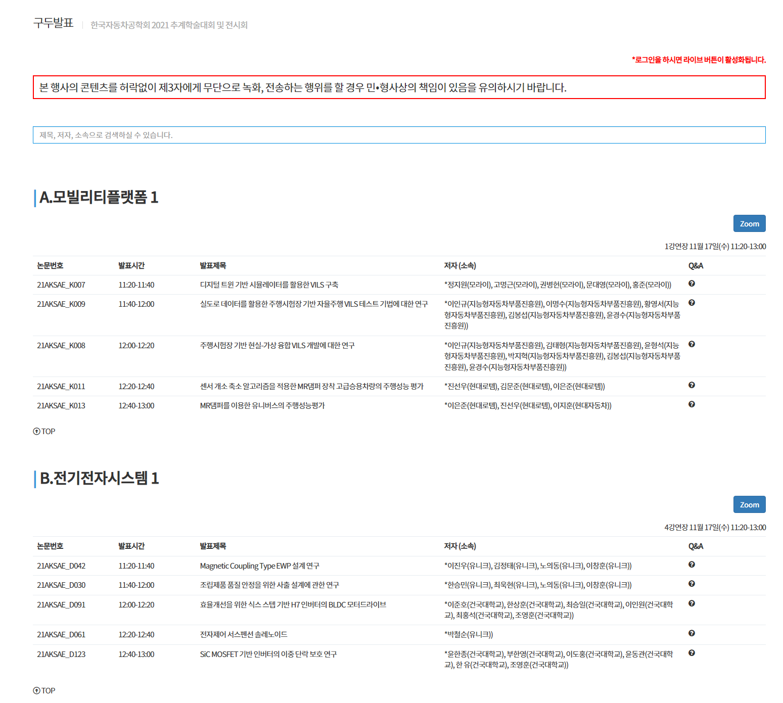 행사 홈페이지는 학회 맞춤형 홈페이지(발표자료 확인 및 줌 입장을 위한 홈페이지)에 동영상 스트리밍 서비스, 발표자료 및 동영상 업로드 기능을 추가하여 구축되었습니다. 실시간 행사는 ZOOM 과 YOUTUBE로 학회에서 별도 진행해주셨습니다.