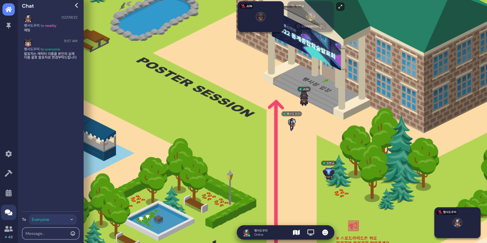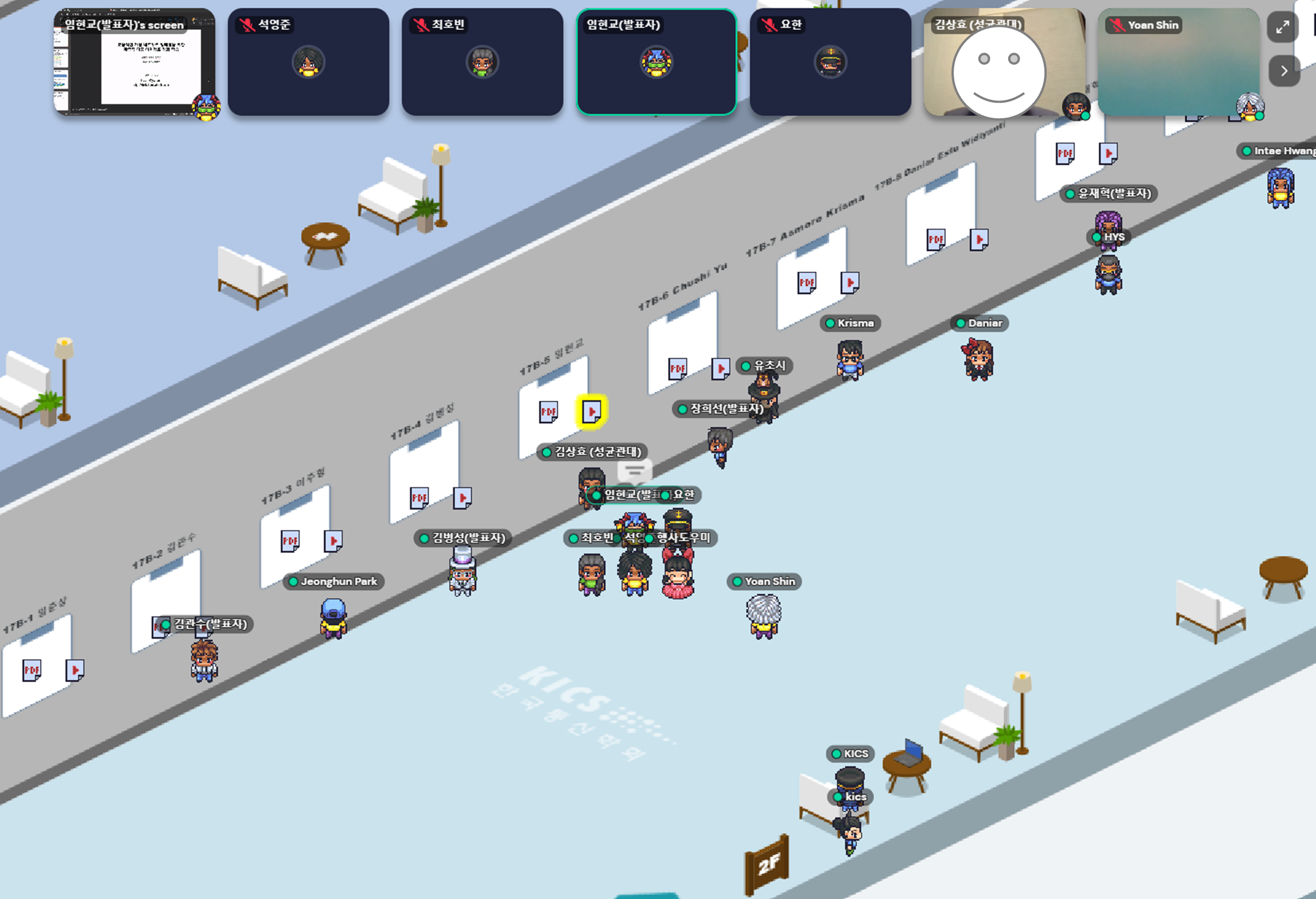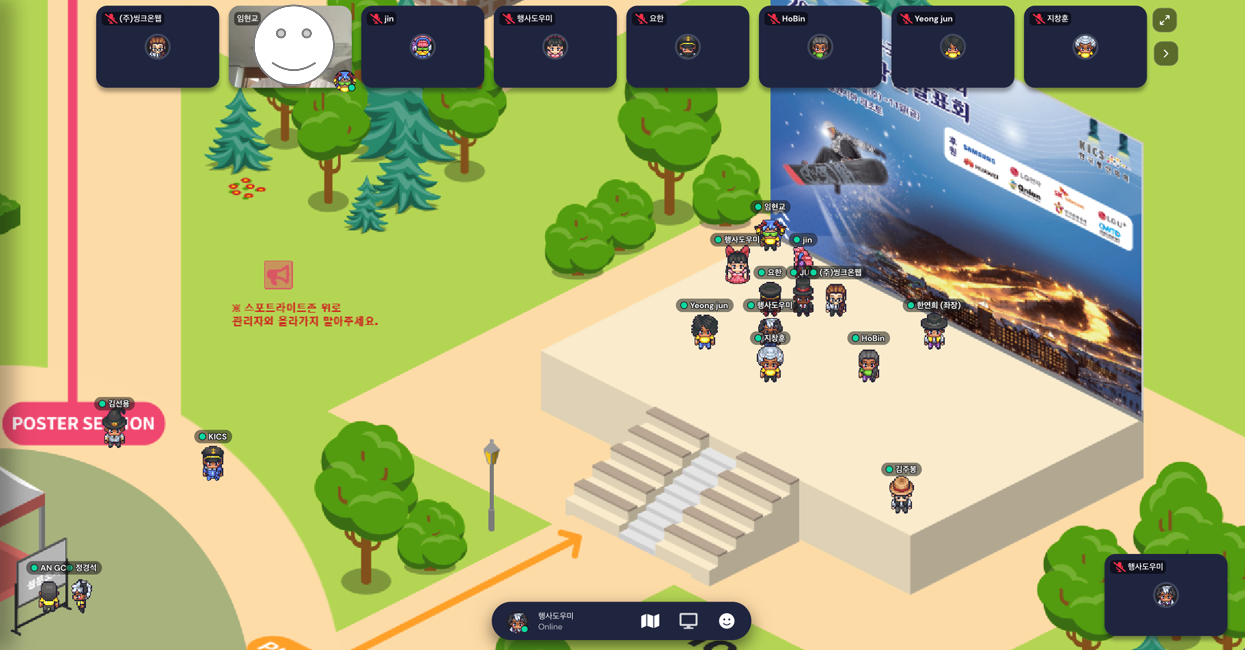 이전 학술대회와 다르게 이번 학술대회에서는 메타버스 특별세션을 하나의 포스터 세션으로 구성하여 진행되었으며, 게더타운을 활용하여 맵의 구성과 디자인부터 실제 행사 진행까지 씽크온웹에서 제작하여 진행되었습니다.