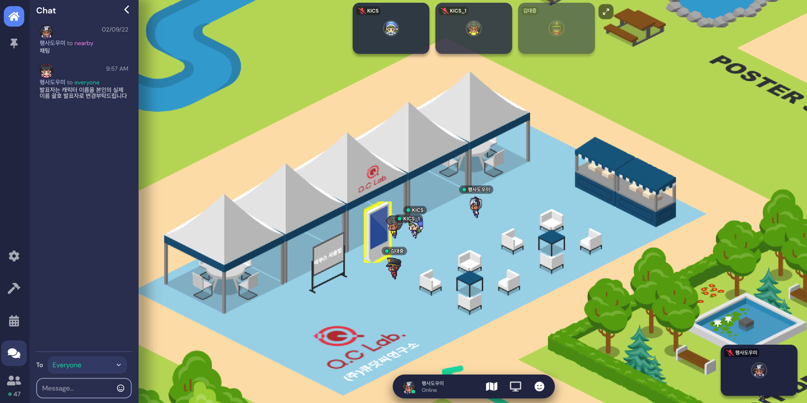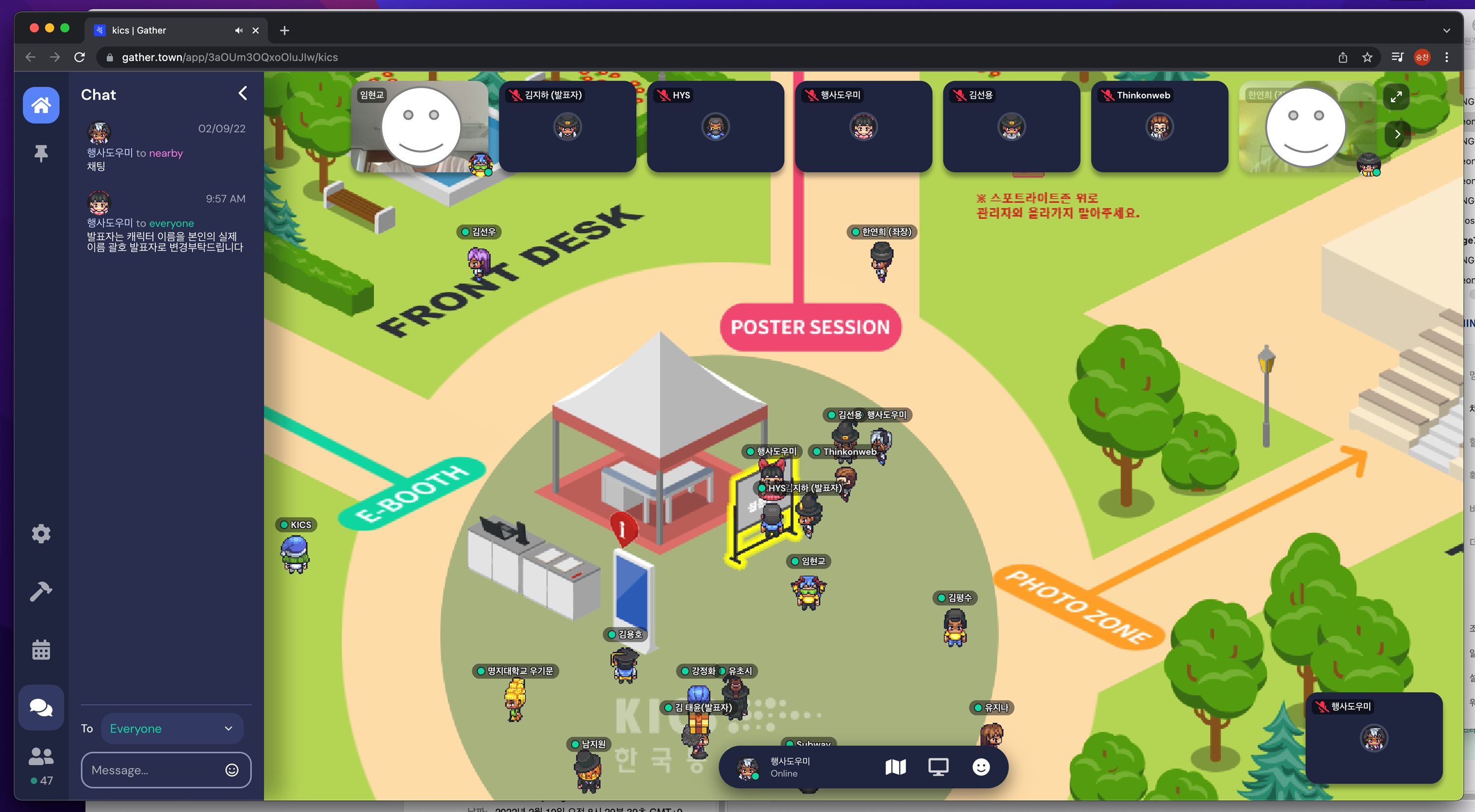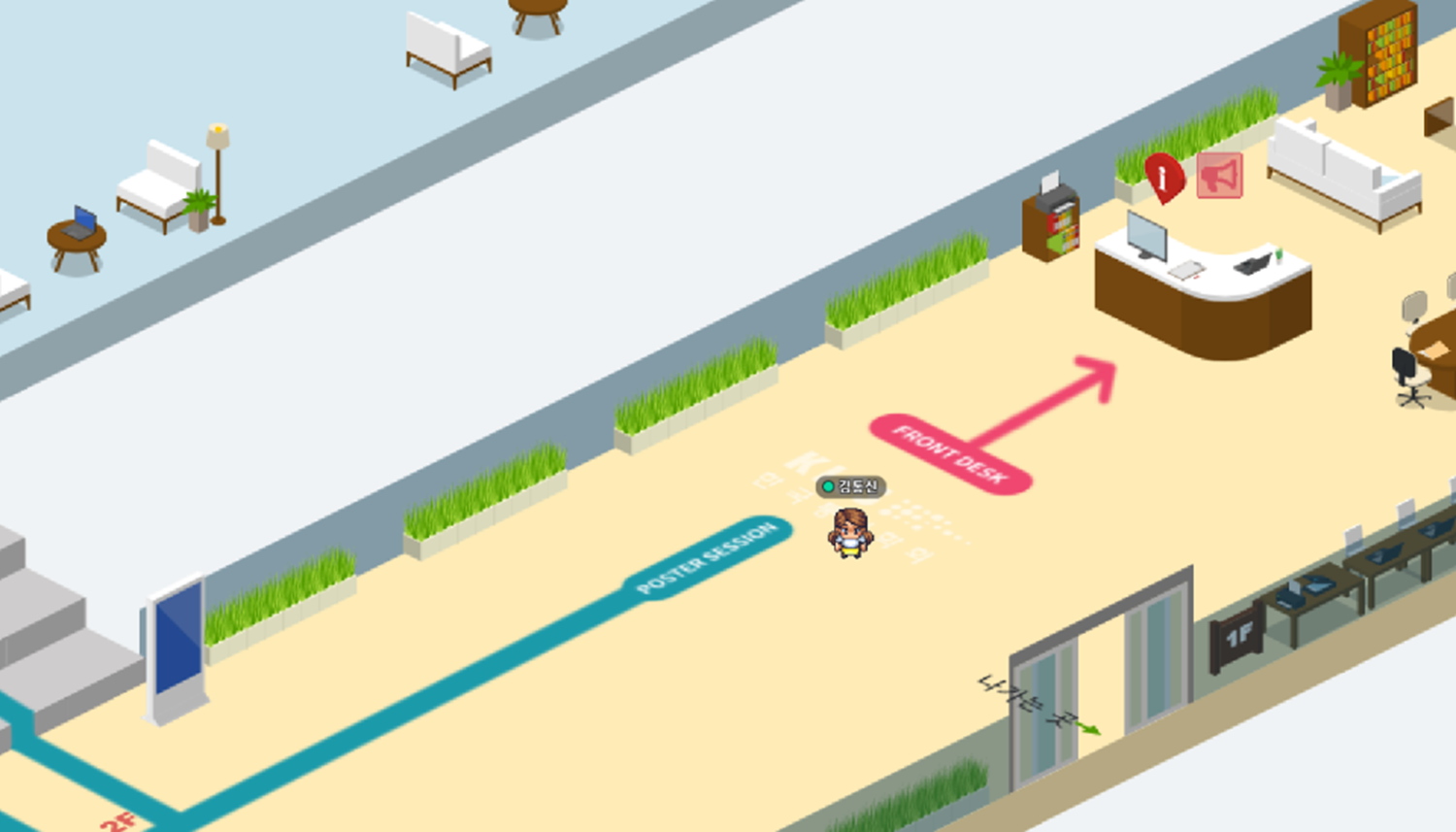 이전 학술대회와 다르게 이번 학술대회에서는 메타버스 특별세션을 하나의 포스터 세션으로 구성하여 진행되었으며, 게더타운을 활용하여 맵의 구성과 디자인부터 실제 행사 진행까지 씽크온웹에서 제작하여 진행되었습니다.