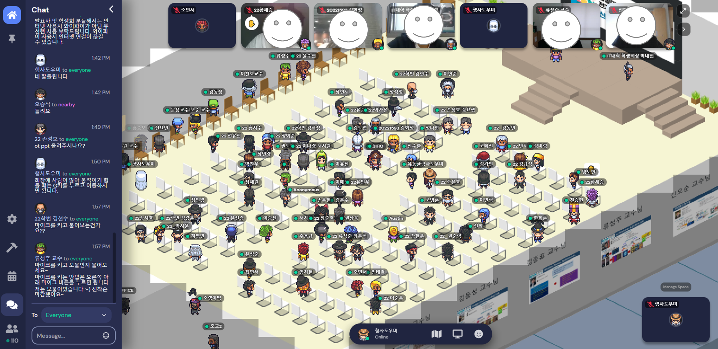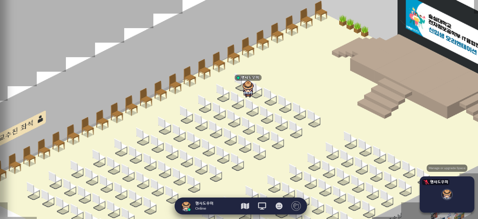 학생 및 교수진 모두가 모여 오리엔테이션이 이루어지는 강당으로 강당안에 있는 모든사람들이 연결되어 화면공유, 대화 등이 이루어지는 공간입니다.