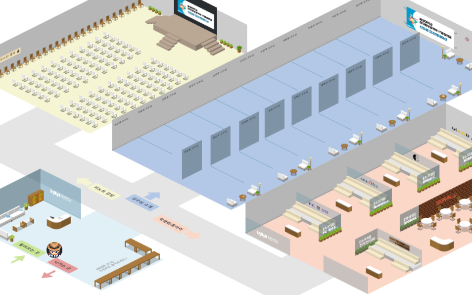 내부맵 입장시의 장소이며, 행사 안내, 화살표를 따라 각각의 행사 장소로 이동하는 공간입니다.