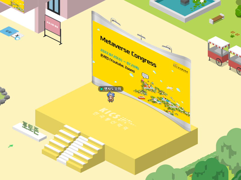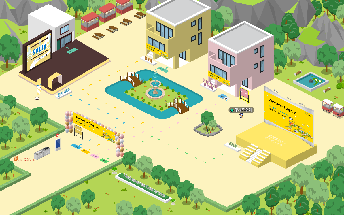 게더타운 입장시 처음 등장하게 되는 곳으로 안내자료, 게더타운 사용 메뉴얼 등을 확인하고 화살표를 따라 원하는 행사장으로 이동하는 장소입니다.