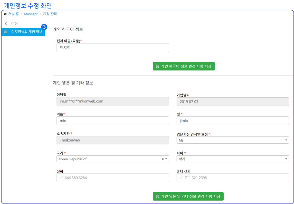 ❸ 로그인 아이디(이메일), 비밀번호를 제외한 기본 정보들에 대해서 수정한 후 저장 버튼을 클릭하면 정보가 저장됩니다.