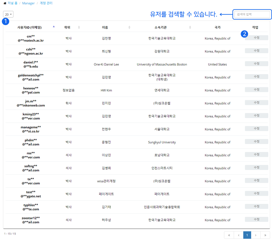 ❶ 계정 관리(Account Management) 메뉴는 저널 구성원(관리자, 편집위원장, 편집위원, 심사자)이나 논문 제출 / 심사자에 대해서 계정 정보를 수정할 수 있는 메뉴입니다.