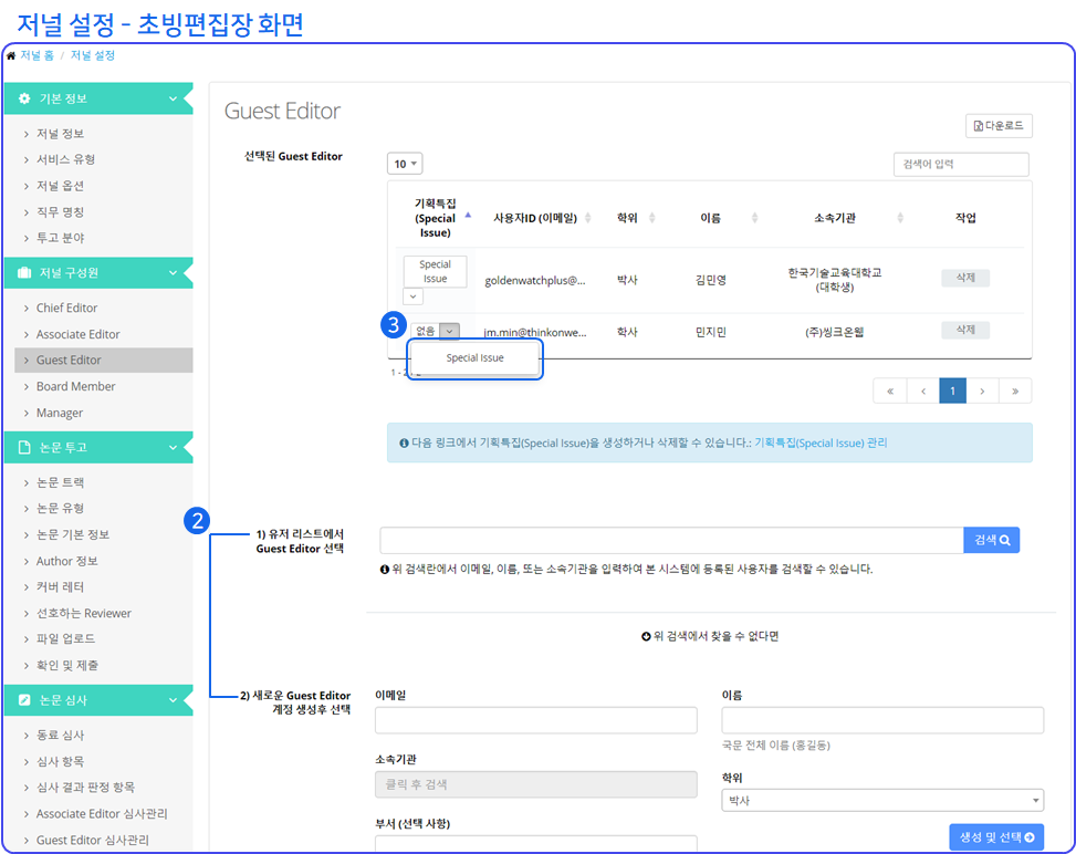 ❶ 유료 서비스의 경우 기획특집(Special Issue / Section)을 생성하고, 초빙편집장을 임명하여 논문을 접수받을 수 있습니다.