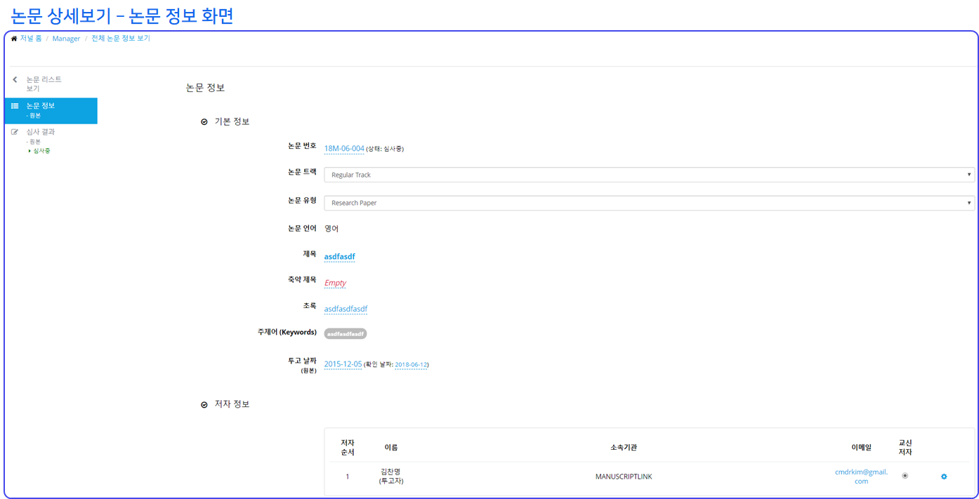 논문투고 시스템 [관리자] - 전체 논문 정보 보기(Manuscript Information Overview)