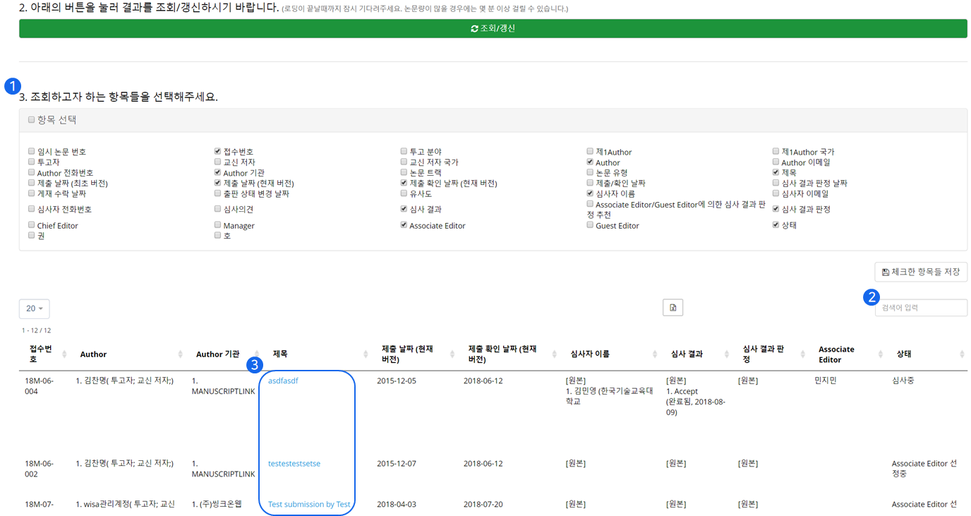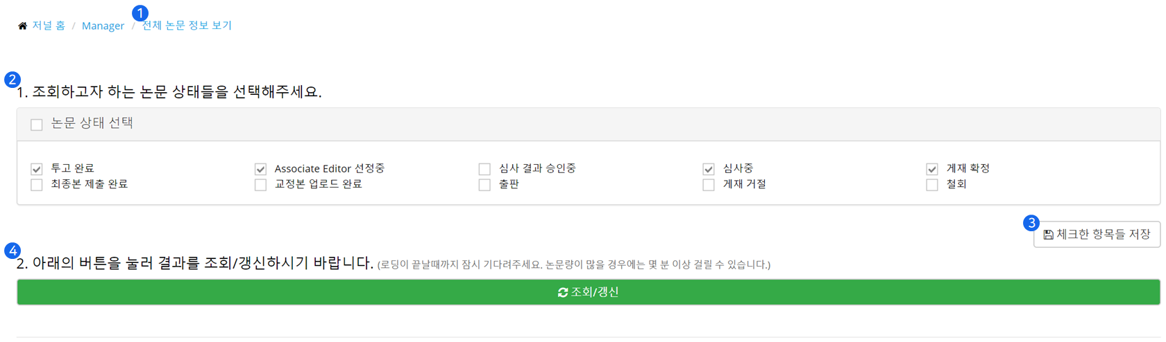 ❸ '체크한 항목들 저장(Save Checked items)' 버튼을 클릭하면 자주 조회하는 논문 상태(예: 철회 논문을 제외한 모두)를 저장해놓고 나중에 이를 활용할 수 있습니다.