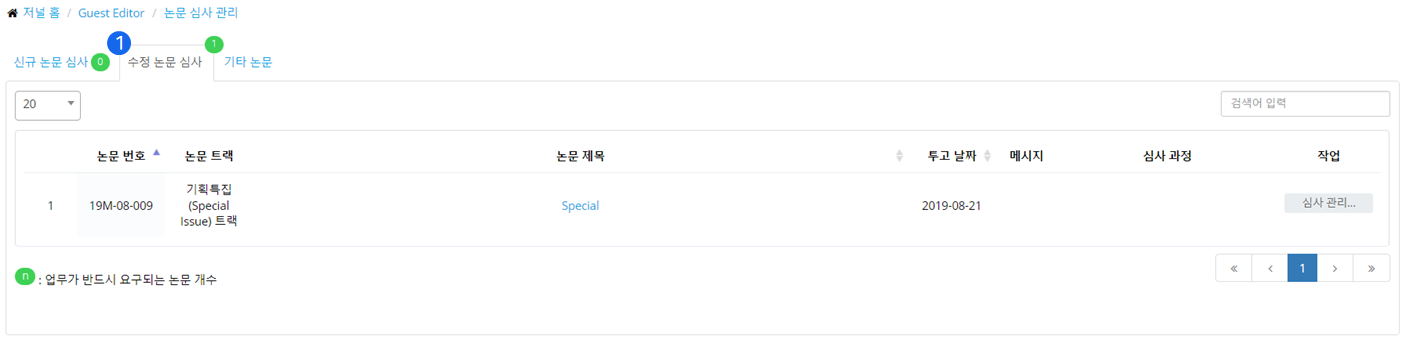 ❶ 수정 논문 심사(Revised Manuscripts) 탭에서는 관리자에 의해 승인된 저자의 수정 후 재투고 논문을 심사 관리할 수 있습니다. (심사 관리에서 심사자 초빙/할당의 방식은 신규 논문 심사(New Manuscript) 탭에서의 심사 관리 방식과 동일합니다.)