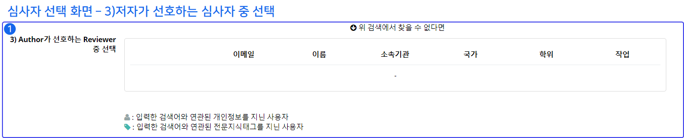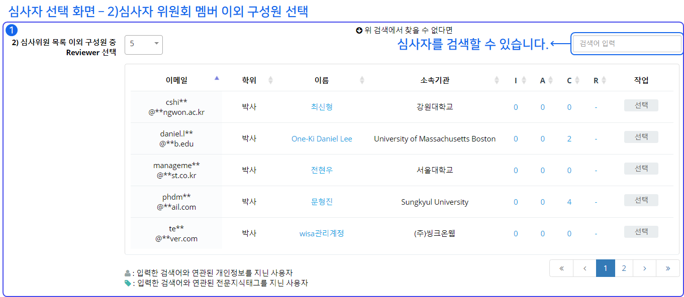 ❸ 검색창을 통해 심사자의 이름, 이메일, 기관, 관심(전문)분야를 검색하여 검색 결과를 바탕으로 심사자를 선택할 수 있습니다.