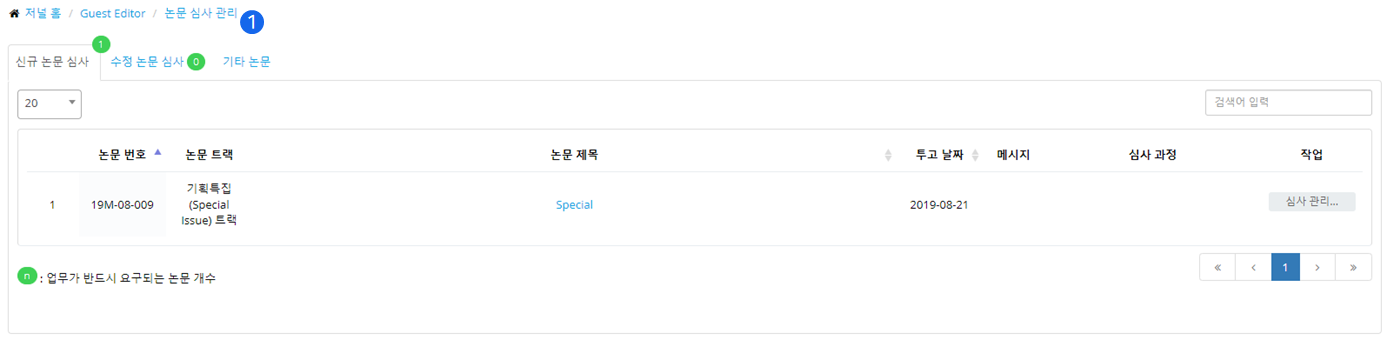 ❶ 논문 심사 관리(Review Process Management) 메뉴에는 신규 논문 심사, 수정 논문 심사, 기타 논문의 탭이 있어 논문을 심사하는 단계별 상황을 확인하고 다음 단계로 진행할 수 있습니다.
