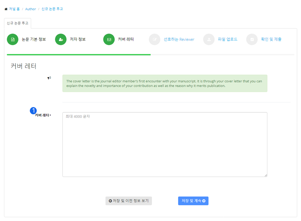❶ 커버 레터는 저널 편집 위원이 저자가 투고하는 논문 내용에 대해 첫번째로 보게 되는 정보입니다. 투고하는 논문이 지니고 있는 기여사항(Contribution)에 대한 신규성 및 중요도에 대해 커버 레터에 언급하여 편집위원에게 알리기 바랍니다.