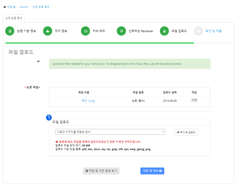 ❶ 파일 업로드 단계에서는 추가 및 업로드(Add & Upload) 버튼을 클릭하여 파일을 업로드 하실 수 있습니다. 이때, 파일 유형(designation)을 알맞게 선택하시기 바랍니다. 일부 저널은 Front Cover, Author Checklist 등의 추가파일 업로드를 요구할 수 있습니다. 이때 또한, 알맞은 파일 유형(designation)을 선택하여 업로드하시기 바랍니다.