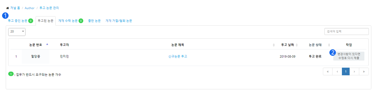 ❶ 제출된 논문은 논문상태에 따라 해당하는 탭에 위치하게 됩니다.