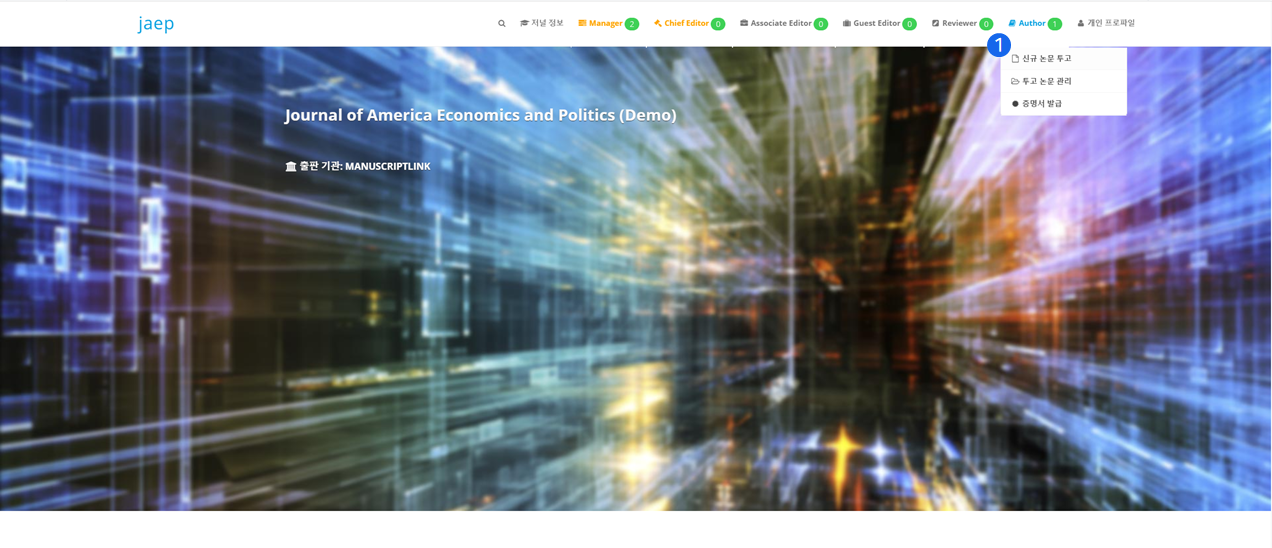 ❶ 로그인을 하시면 기본적으로 화면 상단에 각각의 역할 이름으로 주요 메뉴(관리자(Manager) ,편집장(Chief Editor), 부편집장(Associate Editor), 초빙편집장(Guest Editor), 심사자(Reviewer), 저자(Author))가 있습니다. 그 중 논문을 투고하기 위해서 저자메뉴 중 '신규 논문 투고'를 클릭합니다.