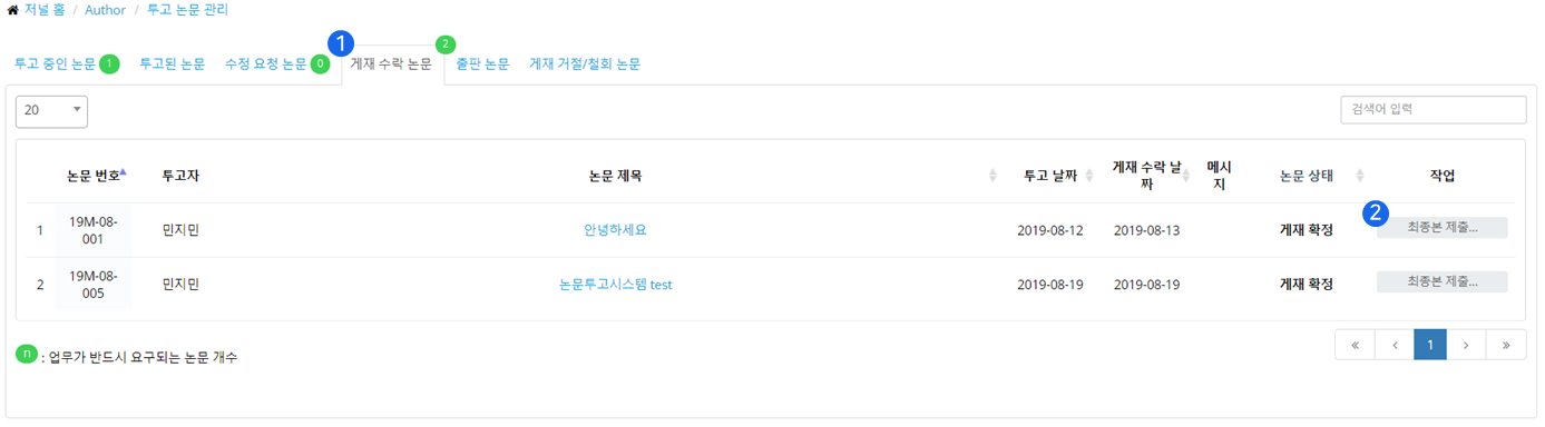 ❶ 게재 수락 논문(Accepted) 탭에서는 심사 최종 결과가 게재 수락일 경우 나타나는 논문을 확인할 수 있습니다.