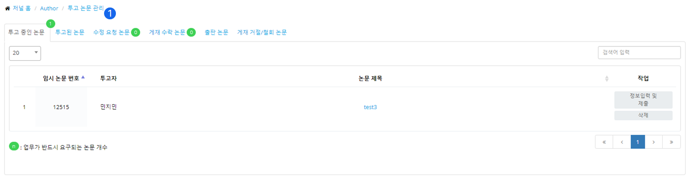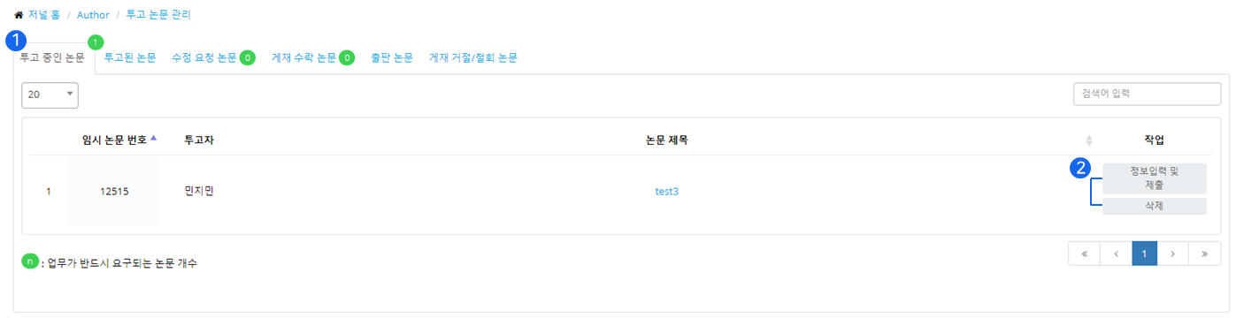 ❶ 투고된 논문(Submitted) 탭에서는 저자가 투고한 논문들의 상태를 확인할 수 있습니다.