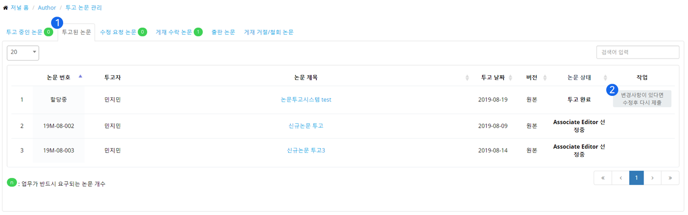 ❷ '변경사항이 있다면 수정 후 다시 제출' 버튼은 관리자가 승인을 하기 전까지만 나타나게 됩니다. 관리자가 승인한 이후에는 이 버튼이 사라지고 논문의 상태가 Associate Editor 선정중으로 변화하게 됩니다.