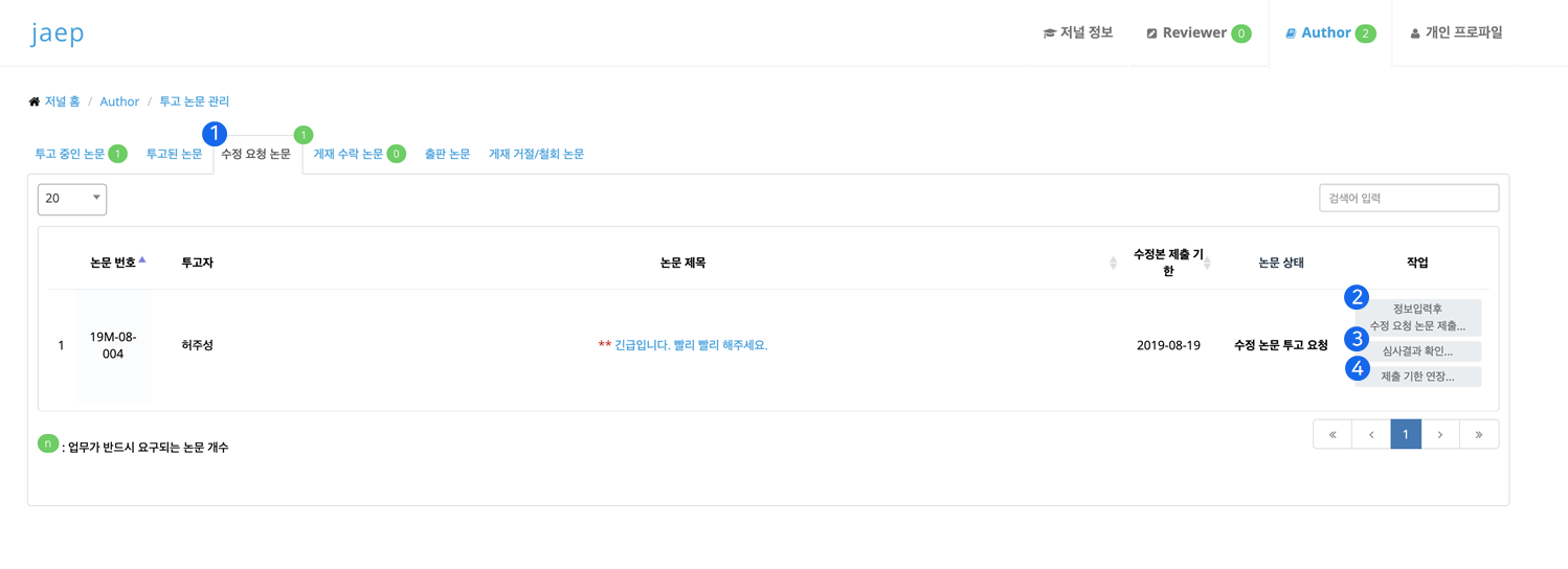 ❶ 수정 요청 논문(Revision Requested) 탭에서는 최종 심사 결과가 재심사일 경우에 수정이 필요한 논문들을 확인할 수 있습니다.