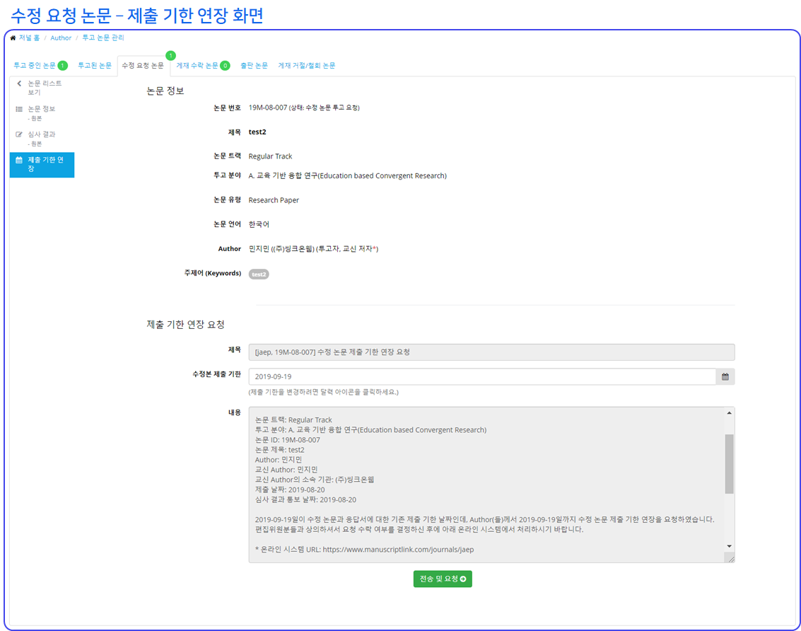❹ '제출 기한 연장' 버튼을 클릭하면 아래의 화면과 같은 제출 기한 연장 요청 메일 화면이 나타납니다. 해당 저널의 관리자에게 수정 논문 제출 기간을 연장해 달라는 메일을 보낸 후 관리자는 편집위원들과의 상의후 요청 수락 여부를 결정하게 되었을때 제출기한이 연장됩니다.