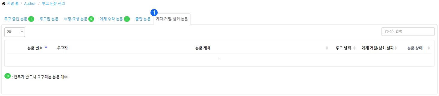 ❶ 게재가 거절되거나 철회된 상태의 논문이 나타는 탭입니다.