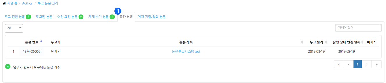 ❶ 출판 논문(Published) 탭에서는 최종본 제출까지 완료되어 출판 상태로 변경된 논문을 확인할 수 있습니다.