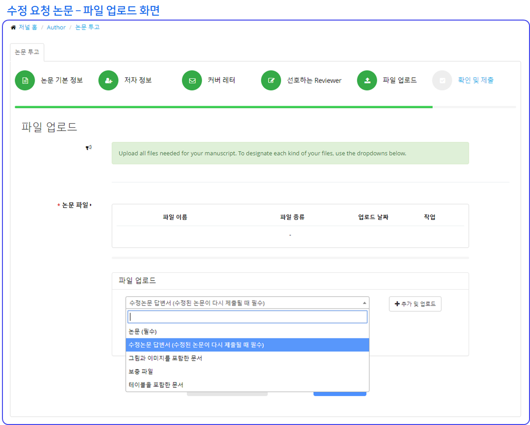 수정 요청 논문을 제출할 때는 수정한 논문 파일, 심사자들의 리뷰에 대한 답변서 파일이 필수로 제출되어야 합니다.