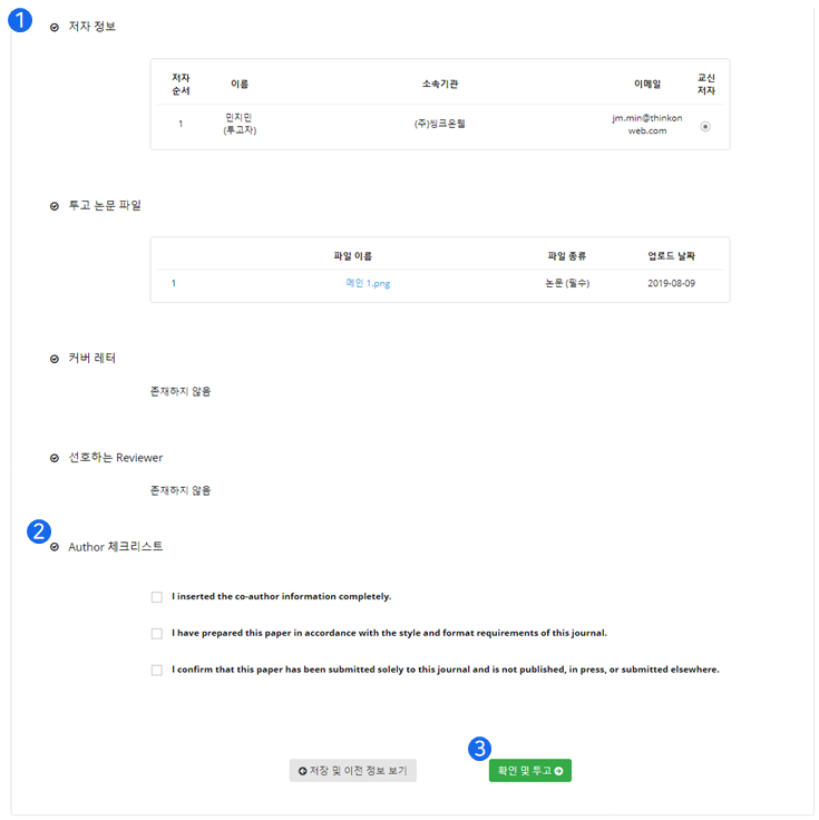 ❸ 문제없이 입력이 되었다면 확인 및 투고 (Confirm & Submit) 버튼을 클릭하여 제출하시기 바랍니다.
