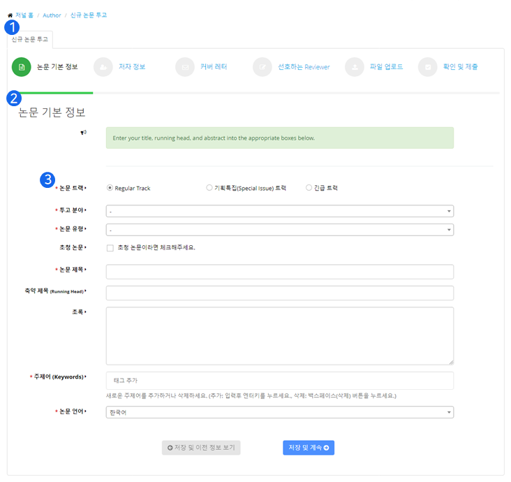 ❷ 첫번째 단계에서는 논문의 기본 정보를 입력할 수 있습니다.