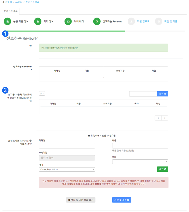 ❶ 선호하는 심사자 선택 단계는 저널 설정에 따라 나타나지 않을 수 있고 필수로 입력해야될 수 있습니다.