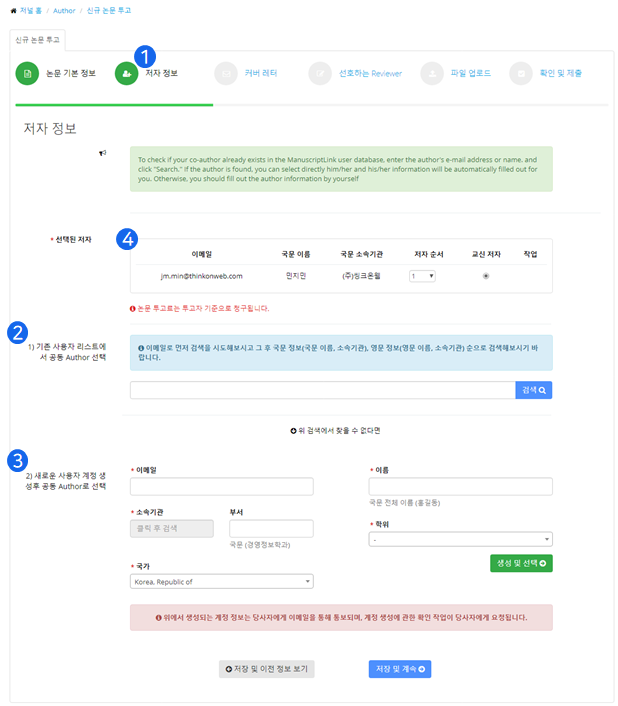 ❷ 첫번째 방법은 기존 회원 정보에서 검색해서 추가하는 방법입니다. 이메일, 이름, 소속기관명 순으로 검색해본 후 선택하여 공동저자를 추가 합니다.