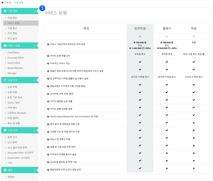 ❶ 저널 개설시 선택한 서비스 유형을 변경해야될 경우가 있습니다. 원하는 서비스 유형에 대한 기능들을 살펴보신 후 서비스 유형을 선택하시면 변경이 됩니다.