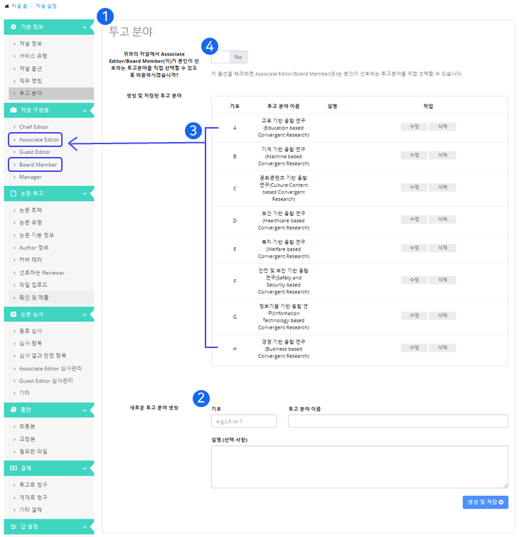 ❷ 새로운 투고 분야는 기호와 명칭을 기입하여 생성하실 수 있습니다.