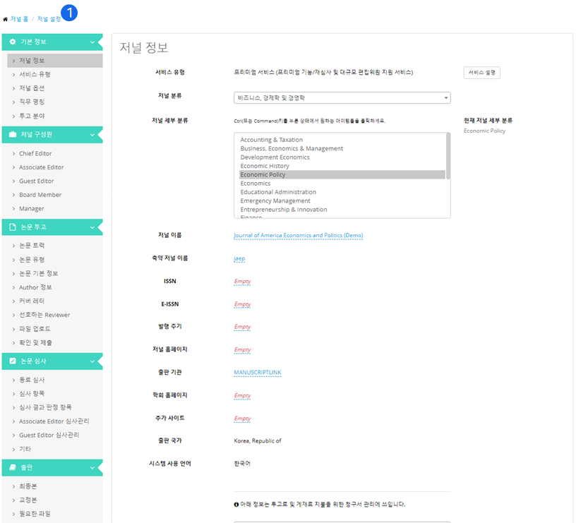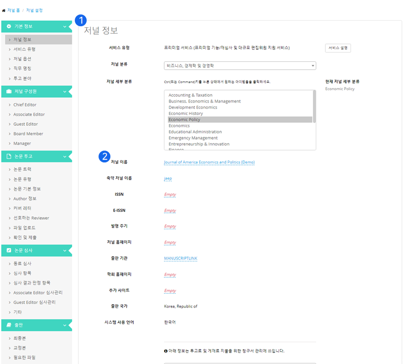 ❶ 저널 정보에서는 저널 이름, 홈페이지 등 기본설정을 할 수 있습니다.