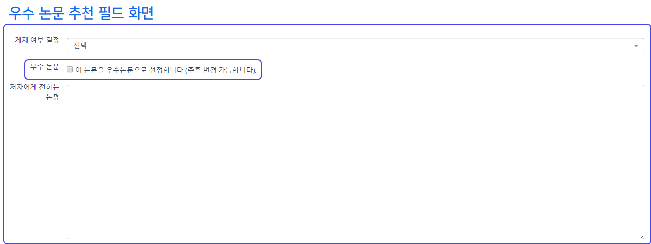 ❷ 우수 논문 추천을 활성화 시킬 경우 아래의 화면과 같이 심사자의 심사지와 위원장의 게제여부 결정 화면에 우수 논문 추천 필드가 형성됩니다.