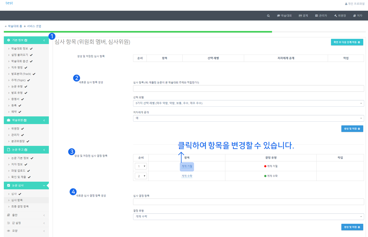 ❶ 심사 항목 메뉴에서는 심사자가 논문을 심사할 때 평가할 수 있는 항목을 생성하고 관리할 수 있습니다.