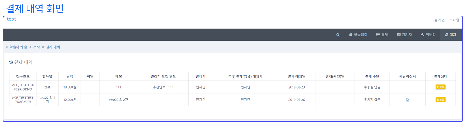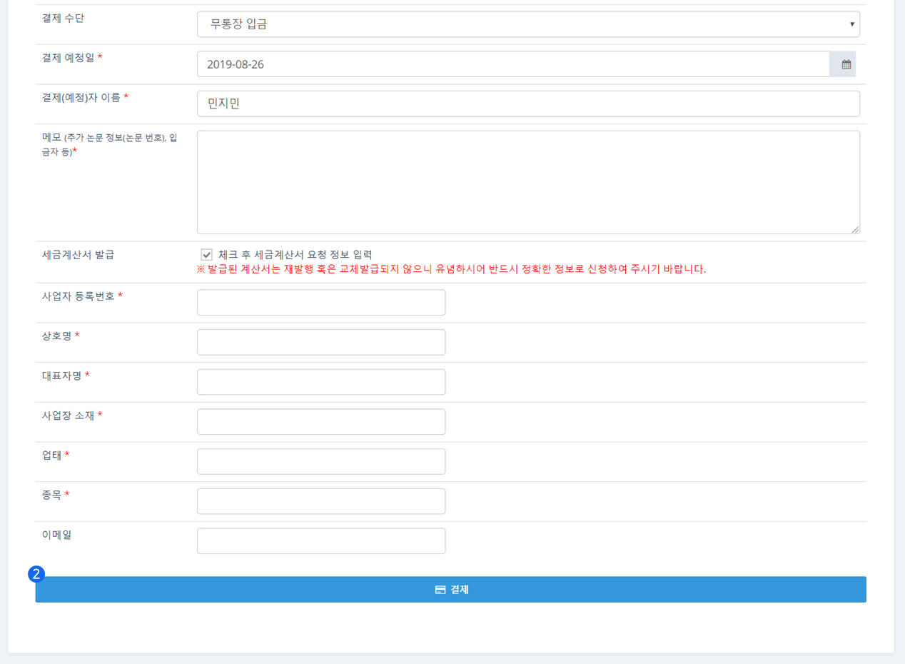 ❷ 결제 예정일, 결제자 이름 등 필수 입력 사항을 작성한 후 결제 버튼을 눌러 결제를 완료합니다. 결제를 완료하면 아래의 화면과 같이 결제 상태 등을 확인할 수 있는 결제 내역 화면이 나타납니다.