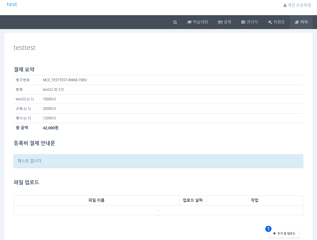 ❶ 등록 정보를 작성한 뒤 등록 및 결제 버튼을 클릭하면 이와같은 화면이 나타납니다. 학술대회마다 요청하는 파일이 다르지만 학생증과 같이 결제시 안내되어있는 파일을 업로드할 수 있습니다.