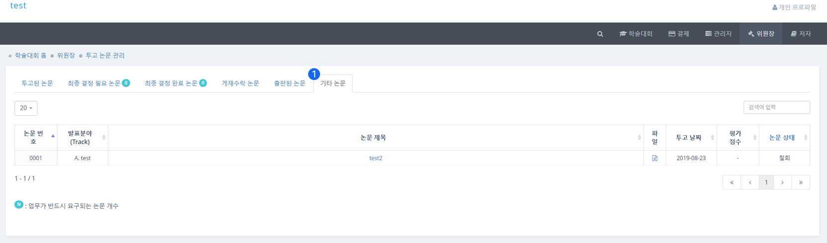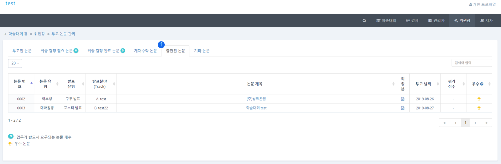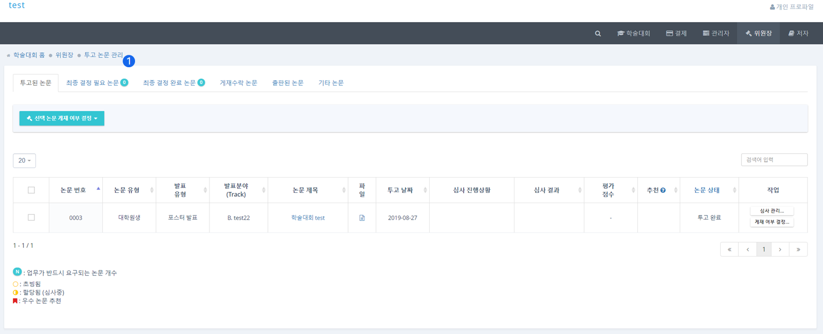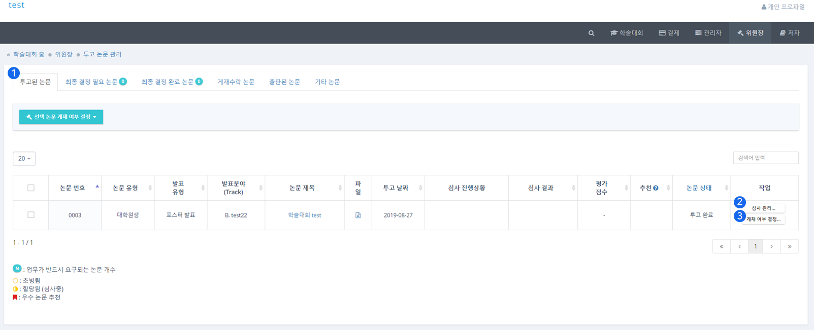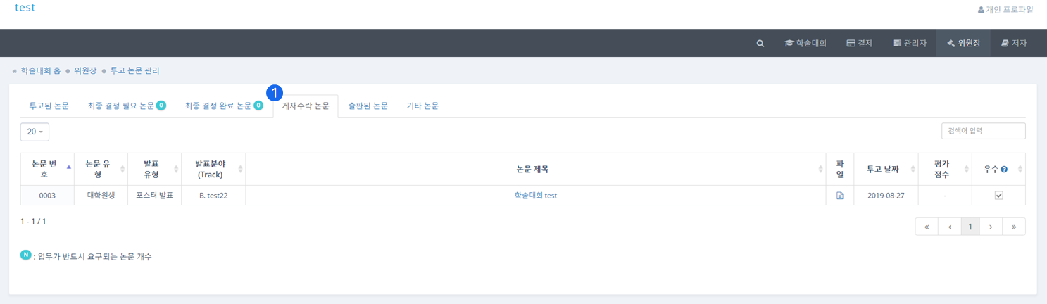 ❶ 최종 결정 완료 논문(Decision completed) 탭에서는 최종적으로 심사가 완료된 논문을 관리할 수 있습니다.