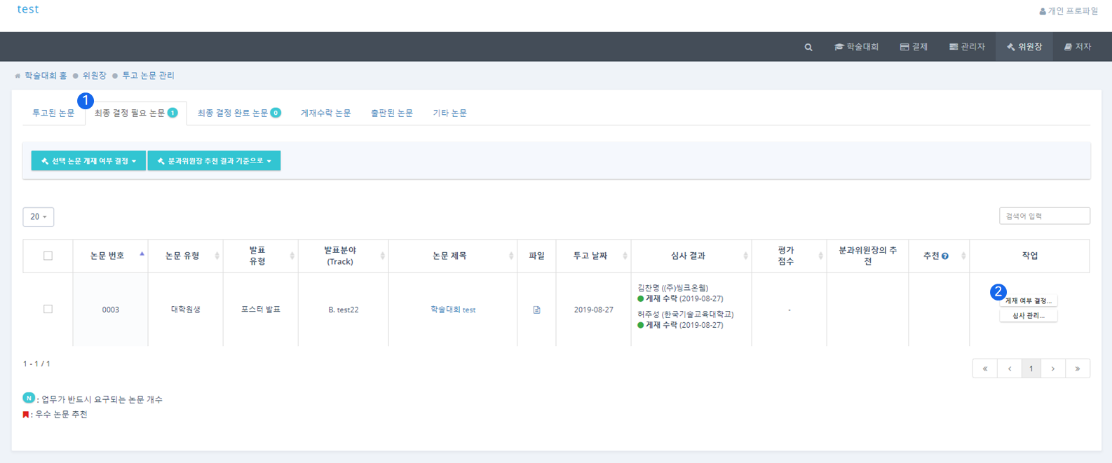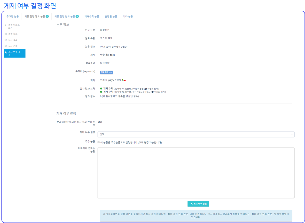 ❶ 최종 결정 필요 논문(Required for Final Decision) 탭에서는 위원장이 심사가 완료된 논문에 대해 게재 여부에 대한 최종 판정을 할 수 있습니다.
