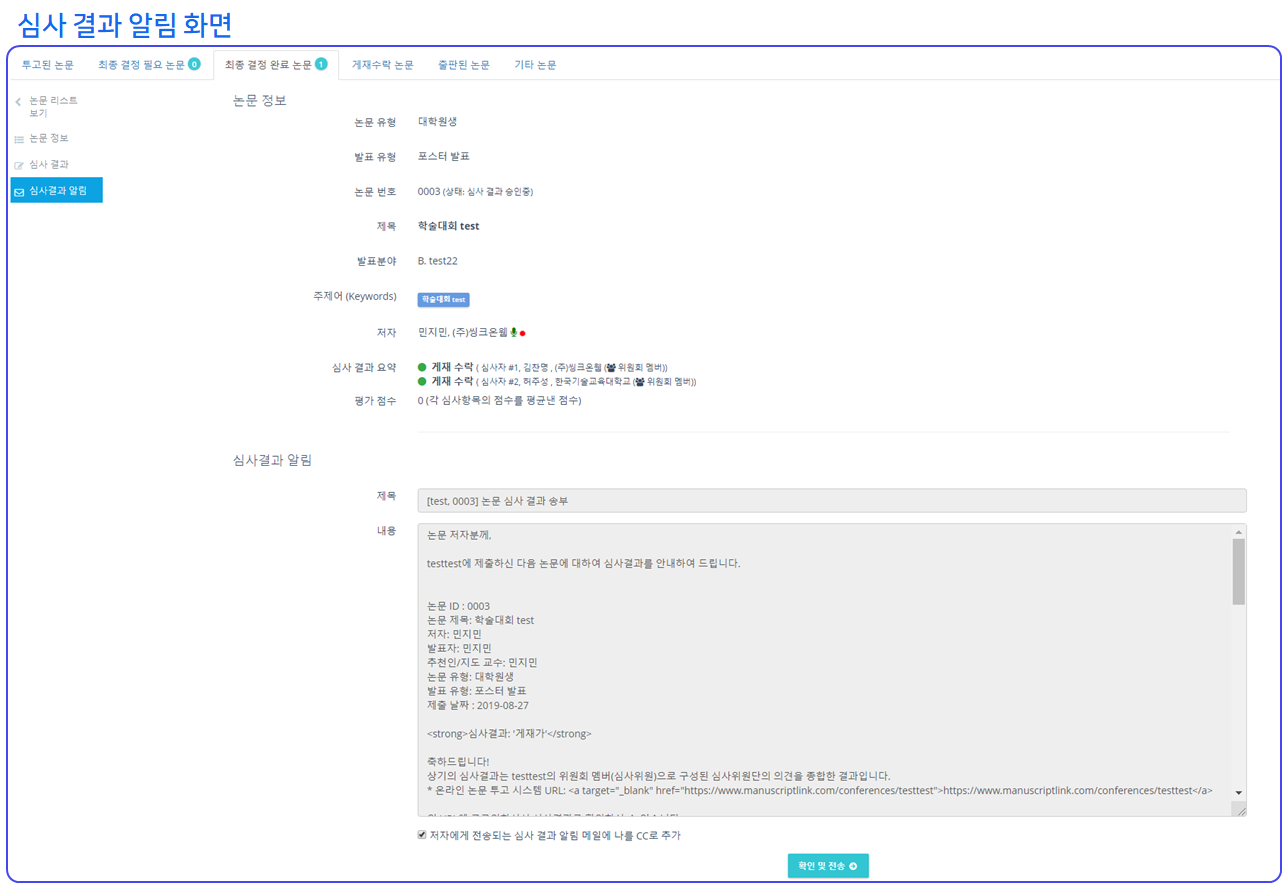 ❷ 관리자 혹은 위원장은 최종심사 결과를 '심사 결과 알림' 버튼을 눌러 메일로 전송할 수 있습니다.