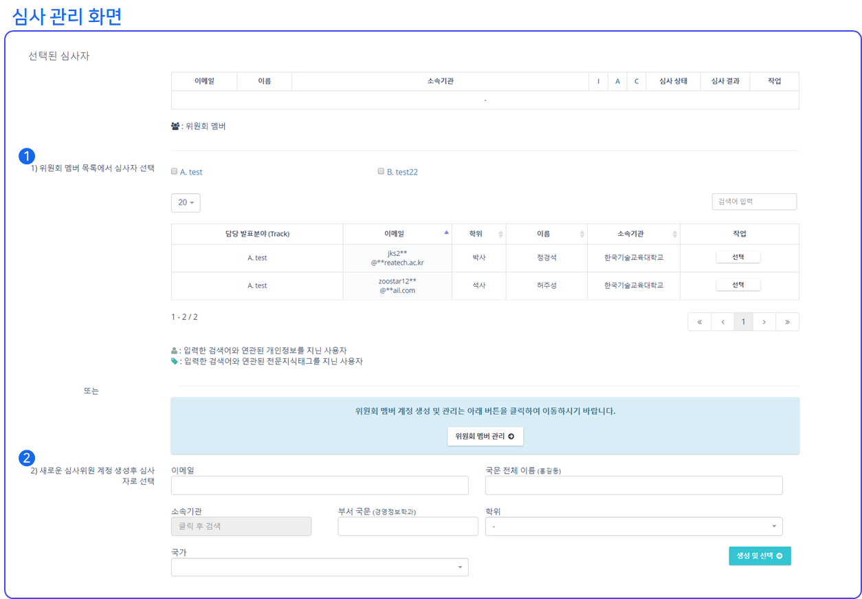 ❷ 위원회 멤버가 아니며 위원회 멤버 계정을 생성하지 않고도 바로 심사위원 계정을 생성하여 심사자로 선택하는 방법도 가능합니다.