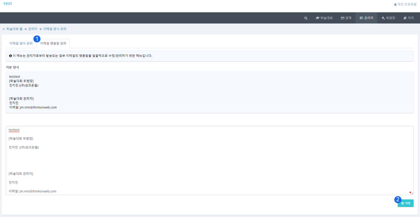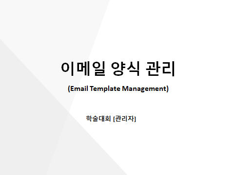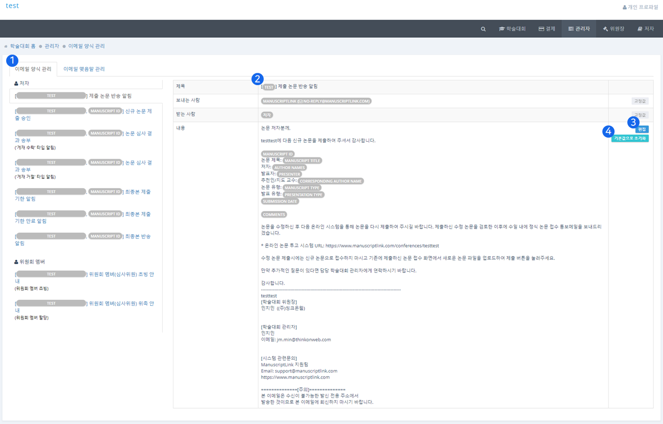 ❶ 이메일 양식 관리(Email Template Management) 메뉴에서는 제출 논문 반송 알림, 신규 논문 제출 승인 등 해당 학술대회에서 발송되는 이메일 양식을 수정할 수 있습니다.
