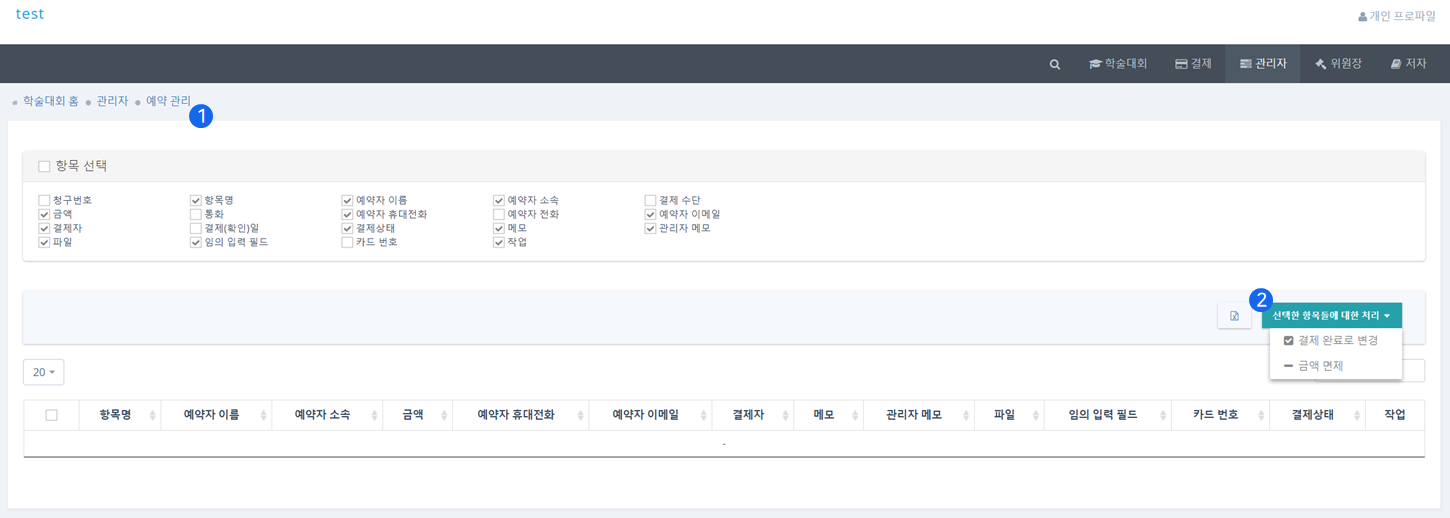 ❷ 예약 목록에서 항목 하나하나 '결제 완료로 변경', '면제', '삭제' 버튼을 클릭하여 작업을 할 수 있지만, '선택된 항목들에 대한 처리'를 이용하여 여러 항목을 선택하고 한번에 결제완료로 변경 혹은 금액 면제 작업을 할 수 있습니다.