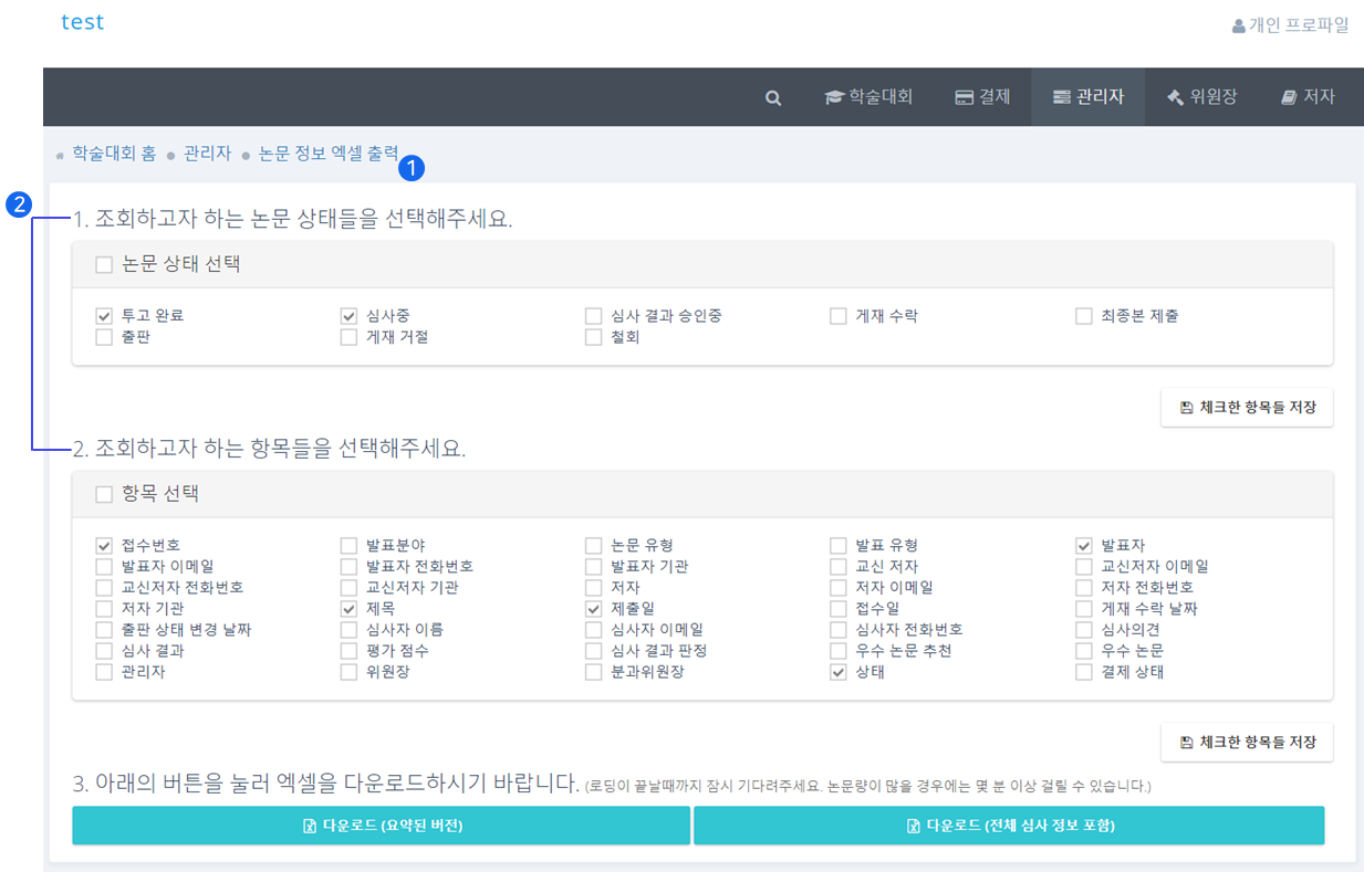 ❷ 엑셀로 출력하고자 하는 논문 상태와 항목을 선택한 후 다운로드 버튼을 클릭합니다.