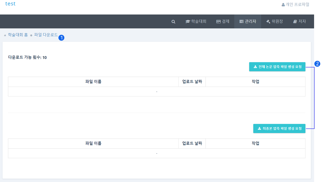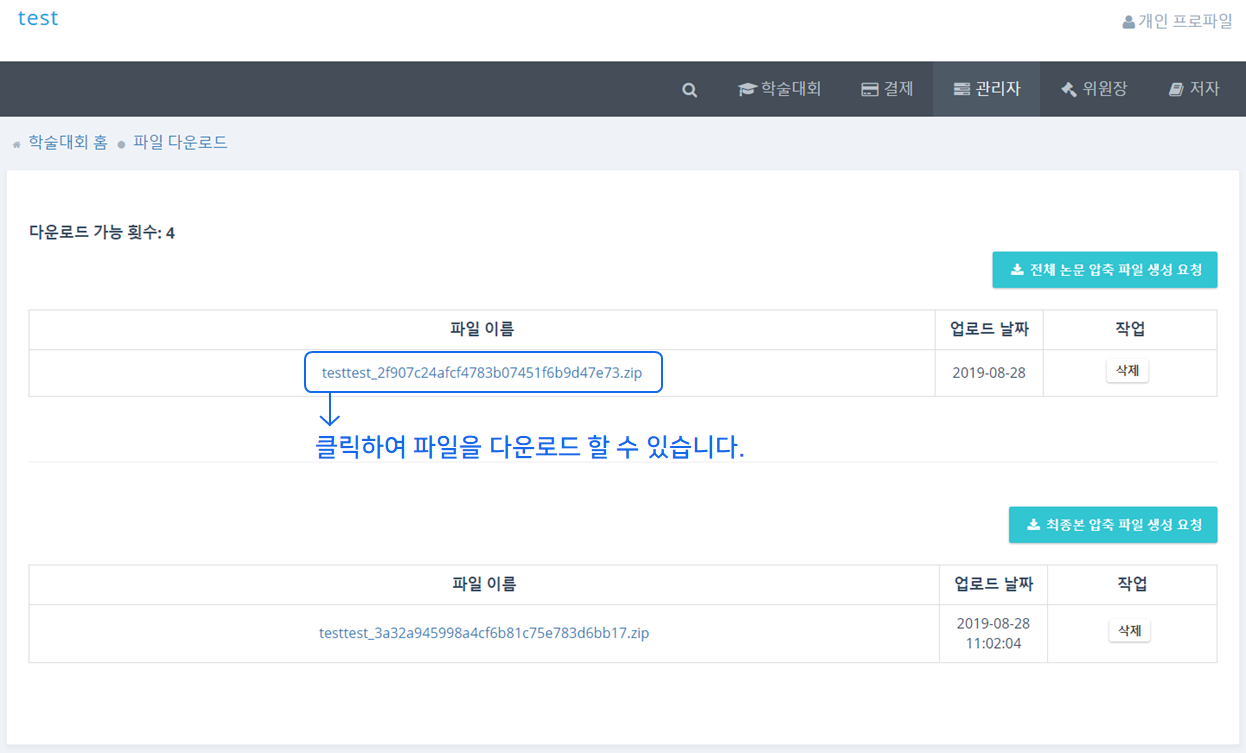 ❷ '전체 논문 압축파일 생성 요청'과 '최종본 압축 파일 생성 요청' 버튼을 클릭하면 아래의 화면과 같이 테이블에 파일이 형성됩니다. 파일의 이름을 클릭하면 압축 파일이 다운로드 됩니다.